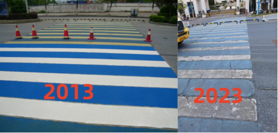 위 사진에서 보듯이 1.5 강화 유리 비드를 도로에 도포한 지 10년 만에 변화가 뚜렷이 나타나 부식 방지 성능과 내마모성이 자명합니다.